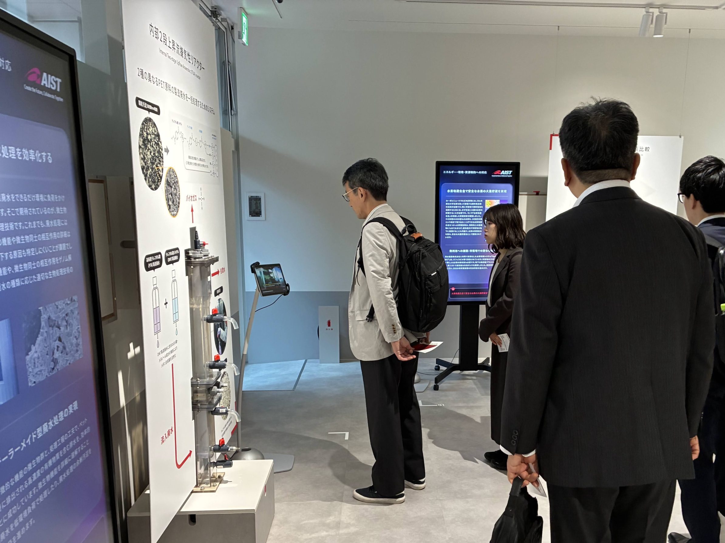 AIST-Cubeでは、世界が直面する3つの社会課題 — ①エネルギー・環境・資源制約への対応、②人口減少・高齢化社会への対応、③レジリエントな社会の実現 ― について、産総研が行っている研究が展示されています。