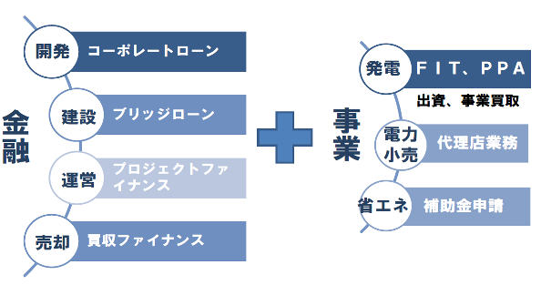 下図左の様に、開発、建設、運営、売却の各ステージでファイナンスを提供するとともに、右側事業では、FITやPPAの発電事業、電力小売代理店事業、省エネ事業を提供しています。