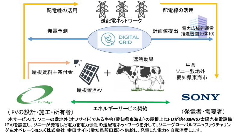 「自己託送」制度を活用した再エネ供給も実施しています。ソニー様、FD様と共同で実施した事業では、ソニー敷地外の牛舎の屋根に設置した約400kWの太陽光発電設備で発電したソニーグループの電力を、電力会社の送配電ネットワークを介し、約30km離れたソニーグローバルマニファクチャリング&オペレーションズ株式会社の幸田サイトへ供給(自己託送)することにより、この発電した電力の自家消費を実現しています。