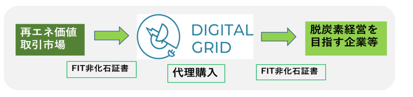 デジタルグリッドが企業等の電力需要家の代わりに入札をすることで、脱炭素経営に向けてFIT 非化石価値へのニーズがありながら取引ノウハウのない需要家向けに、手軽にFIT 非化石証書を購入できるサービスを提供しています。