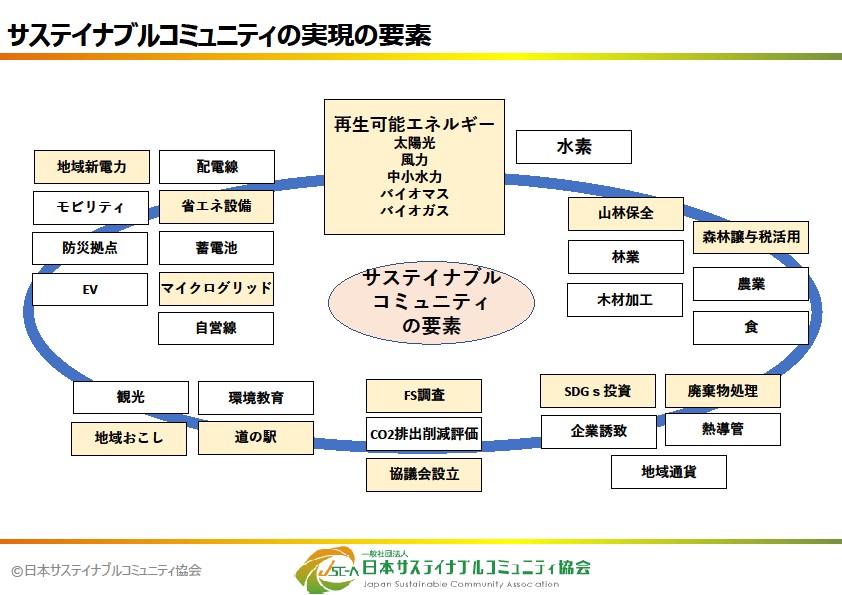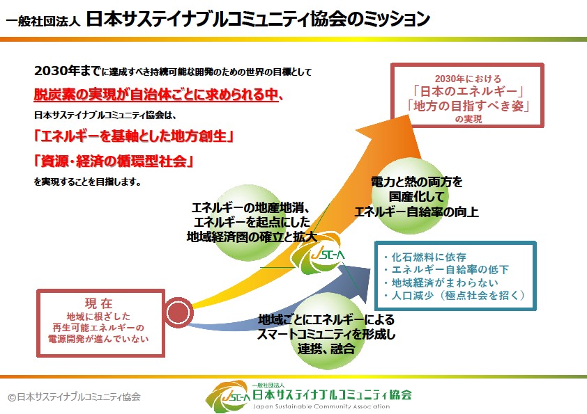 一般社団法人日本サステイナブルコミュニティ協会は、「エネルギーを基軸とした地方創生」「経済の循環型社会」を実現することを目指し2018年に設立しました。当協会では、「連携」と「実装」をキーワードとして実現に向けて取り組んでいます。現在は、正会員12社、賛助会員12社のほか特別会員として22の自治体等が会員として活動に参加しており、民間企業、自治体、金融機関、研究機関などと連携を図り、サステイナブルコミュニティの実現に向けて活動を推進しています。特に、地域の中で再生可能エネルギーを創り地域の中で使う「域内消費モデル」の実現を通じ、地域のエネルギーレジリエンスを高めるとともに、これまで地域が域外へ支払っていたエネルギーコストを域内で循環させることで、地域の持続可能性の向上を目指しています。
