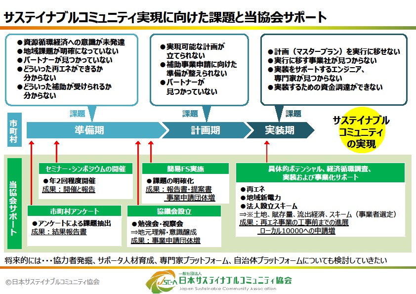 当協会が実施した自治体アンケートによると、地域のサステイナブルコミュニティの実現に向けて、準備段階から実装段階まで多くの課題がみえてきました。そこでこれらの課題を解決するための自治体サポートとして当協会では会員メンバーが主導する委員会を設け取り組みを進めています。