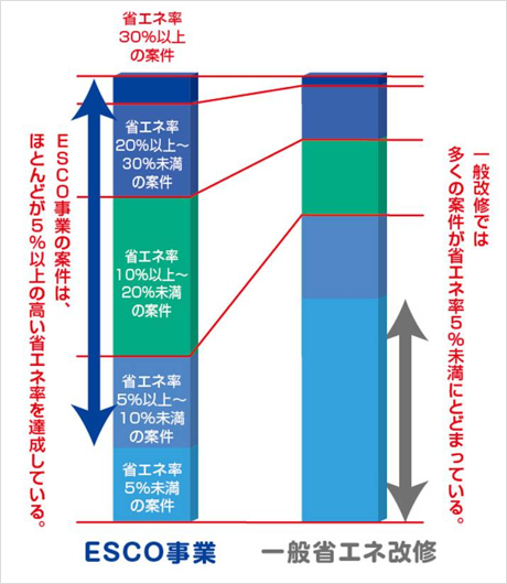 実際に政府の調査結果でも、省エネ達成率において一般的の改修事業と比較して、ESCO事業が優位であることが示されています。