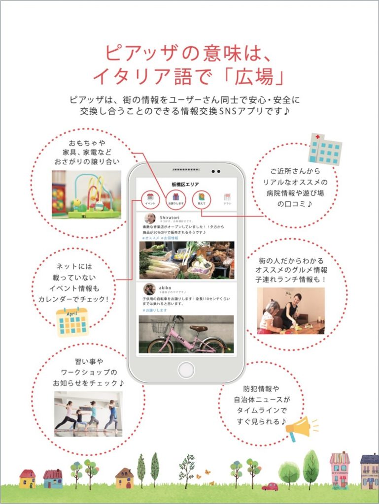 「PIAZZA(ピアッザ)」はイタリア語で「広場」という意味です。街の人がPIAZZA(広場)を介して集まり、暮らしに関する情報をやり取りしたり、ちょっと困った時に相談したり、 使わなくなったモノを必要としている人に譲ったり、気づけば人と人が支え合えている。そんな未来を目指し、地域に特化した地域コミュニティアプリ「ピアッザ」を開発運営しています。街ごとにタイムラインが存在し、ユーザーはそこに自由に投稿をすることができます。利用者は地域の住民、商店の方、自治体の方が中心です。現在東京の中央区(勝どき・日本橋)をはじめ、東京・神奈川・名古屋・大阪を中心に約80のエリアで展開し、次の1〜2年で200エリアを目指しています。