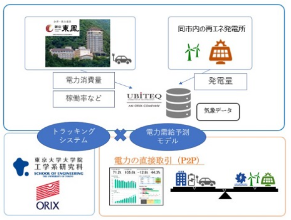 ・オリックスグループが運営する温泉旅館「会津・東山温泉 御宿 東鳳」(福島県会津若松市)において、使用電力実績の変化をAIで分析し、ホテルの稼働率や気象条件などによる電力需要を予測します。また、自然条件によって出力が変動する市内の太陽光や風力発電施設における発電データなどを取得し、供給量を予測した上で、需要側と供給側との電力の直接取引およびマッチング(ひもづけ)の検証を行います。