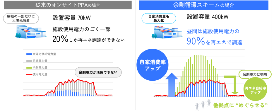 ・全国1200ヶ所以上のオンサイトPPA導入施設で自家消費する以上に生み出した再エネを、地域や自社内など、特定の場所で循環させる新しいサービス「循環型電力」。