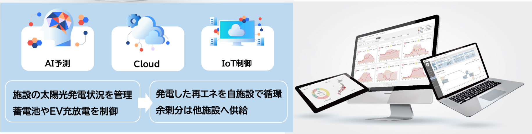 ✓再エネを最大活用するために、施設の電力需要や、気象情報などの外部データに加えて、​太陽光発電、エネマネシステム、蓄電池、EVなど分散型エネルギー源をネットワーク化し、​エネルギーマネジメントを最適化するプラットフォームを独自開発、提供しています。