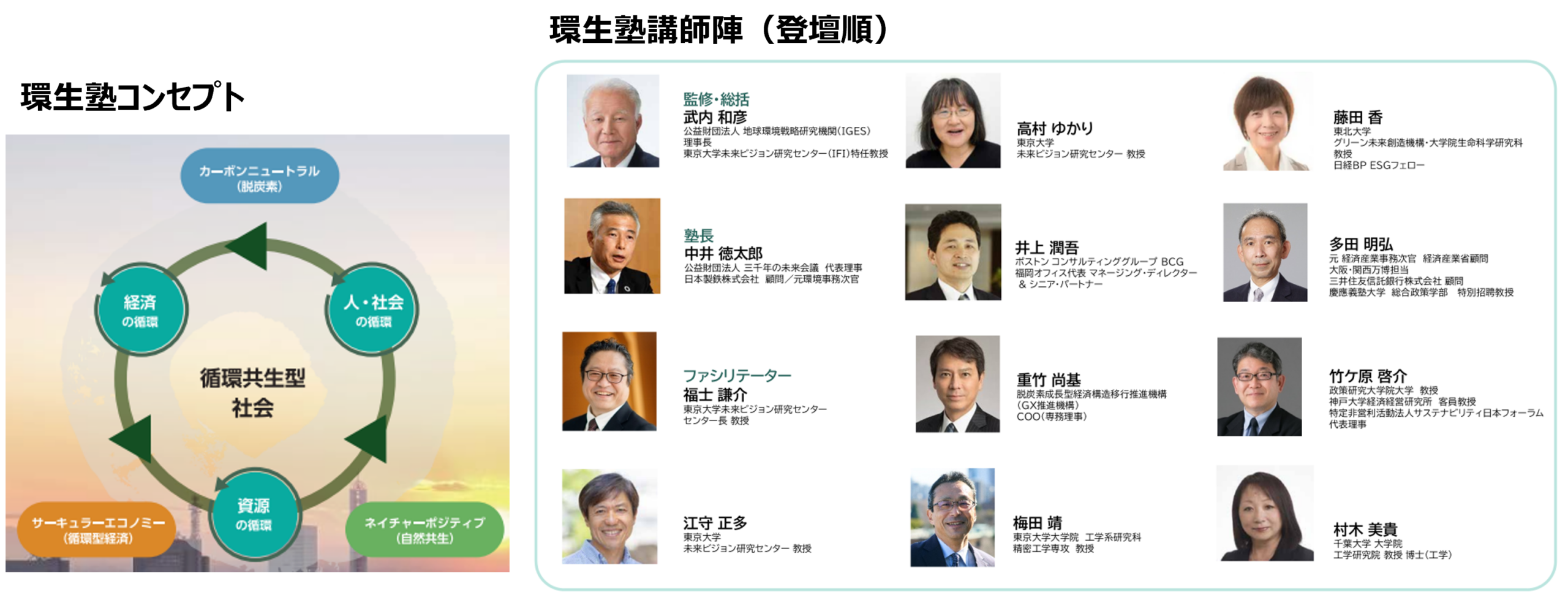 「環生塾」は、公益財団法人 地球環境戦略研究機関(IGES) 理事長の武内 和彦氏、環境省 元·環境事務次官 中井 徳太郎氏(現 三千年の未来会議 代表理事、日本製鉄 顧問)という環境分野で日本を代表するお二人がそれぞれ監修・塾長を務める、他にはないプログラムです。